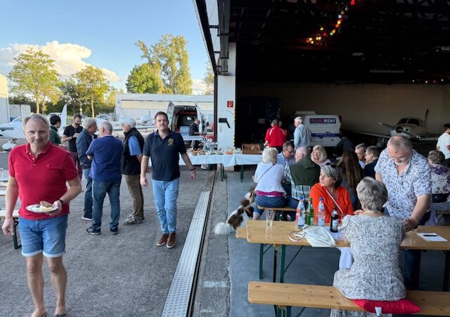 Im Mittelpunkt des Abends standen die Menschen: Vereinsmitglieder, Freunde und Gäste, die zusammenkamen, um das Jubiläum miteinander zu feiern. Der Hangar bot mit viel Platz die richtige Kulisse für Begegnungen, Gespräche und ein herzliches Miteinander. Die Vereinsflugzeuge waren zur Seite geräumt worden, sodass genügend Platz für Bänke, Tische, Stehtische und gesellige Runden entstand. Zwischen herzhaften Speisen, Getränken und angeregten Gesprächen herrschte eine lockere und zugleich festliche Stimmung in der viel über vergangene gemeinsam erlebte Stunden geredet wurde.