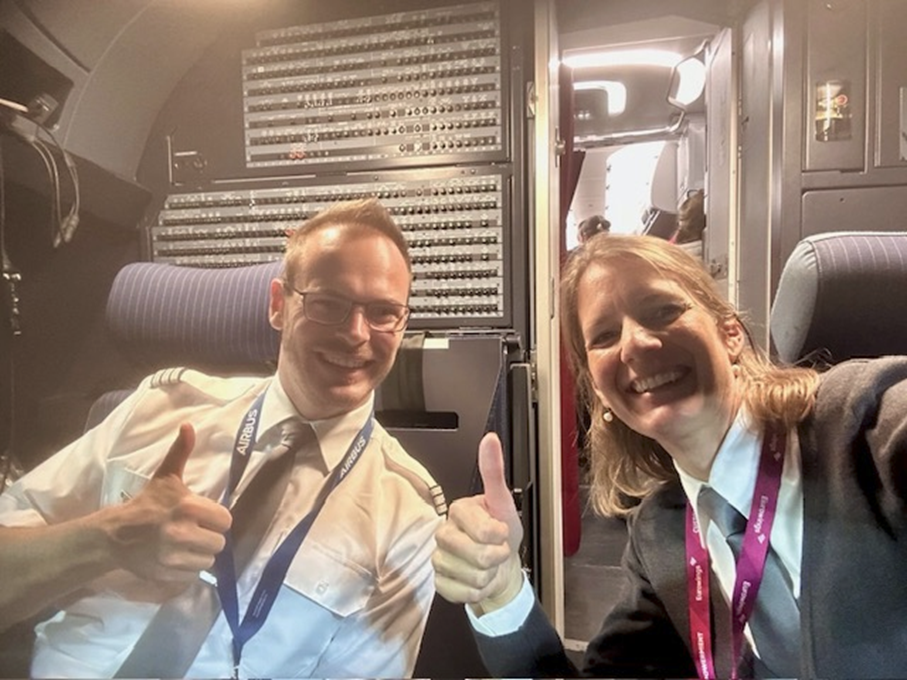Simon Grimm (Erster Offizier) und Katharina Lenarcic (Kapitänin) im Cockpit des A321neo nachdem sie zufällig herausgefunden haben, dass die Flugschule des LSV Worms ihre gemeinsame fliegerische Wurzel darstellt.