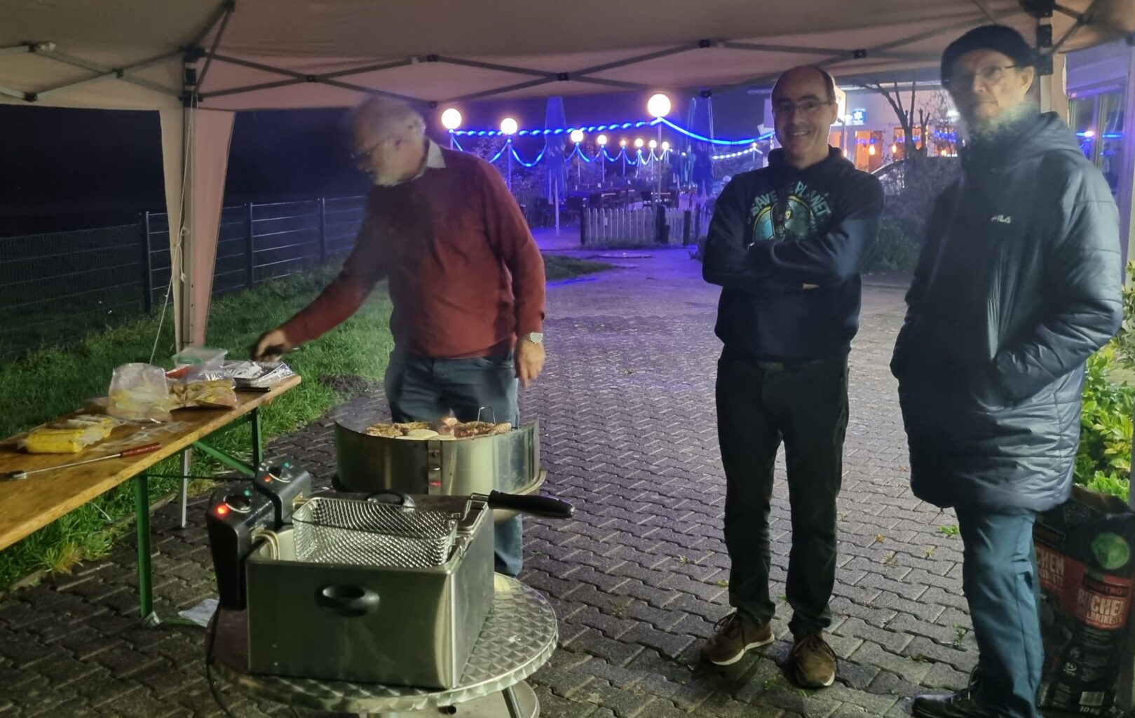 Nachdem alle Segelflugzeuge und Utensilien von unserem Gastflugplatz Lachen-Speyerdorf zurück transportiert und in unserer Halle verstaut waren, wurde am Vereinsheim der Grill aufgebaut. Da das Wetter am vergangenen Sonntag sehr an das des Sommerlagers erinnerte – es regnete leicht, aber gleichmäßig – mussten wir fürchten, dass die Glut im Grill das nicht lange mitmacht. Was tun? Wir haben doch einen Sonnenpavillon! Also aufbauen und drüber über Grill und Friteuse!